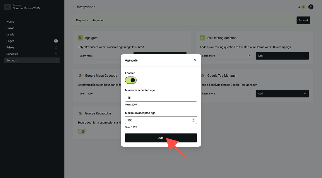 - On the integrations page, you can enable the age gate feature.