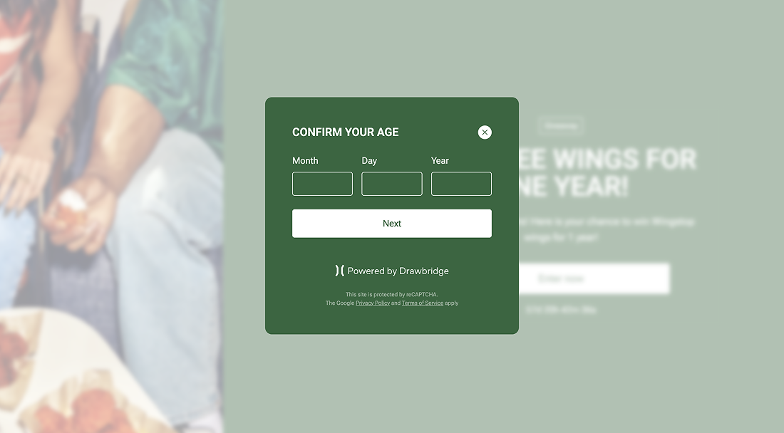 The age gate will appear on your landing page as a pop up right after a page visitor clicks to enter to the giveaway (right before they have to submit their name and email to officially enter the draw). You can also add a skill testing question as a pop up prior to the entry page, which appears in a similar fashion as the age gate feature - as a pop up before the entry page.